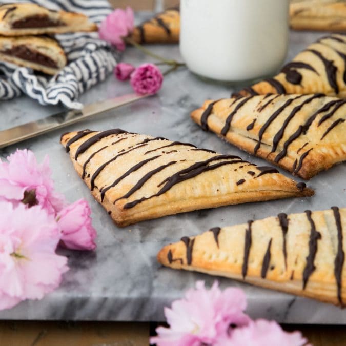 If you’d like, you can also drizzle the turnovers with a simple chocolate glaze. Did you know that at Arby’s the “official” number of stripes on a turnover is 7-9? I worked at one during high school/college (it’s where I met Zach!) and iced hundreds of turnovers in my day. I might have been reprimanded more than once for doing too many stripes… I like a lot of icing on my turnovers!