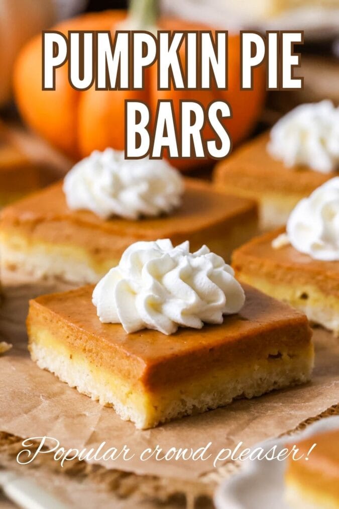 These pumpkin pie bars are a party-ready, crowd-pleasing twist on classic pumpkin pie! Layered over a simple, buttery shortbread-esque crust and topped with a pillow of homemade whipped cream, it’s the perfect Thanksgiving dessert. Recipe includes a how-to video!